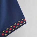 A gola é redonda e traz um padrão com triângulos dourados e losangos vermelhos. Este mesmo padrão é repetido nos punhos.