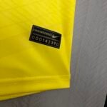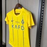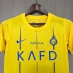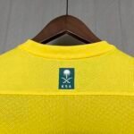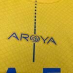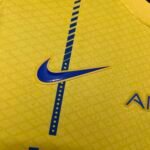 O escudo do clube aparece no lado esquerdo do peito, enquanto o logo da Nike é aplicado em azul com bordas amarelas, no lado direito. Já o patrocínio máster da “KAFD” aparece interrompendo as faixas no espaço máster.