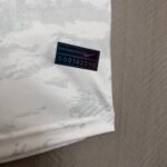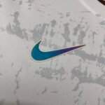 O grande destaque do manto, no entanto, são as aplicações. A Nike estampa o Swoosh em gradiente do azul para o roxo no lado direito do peito, enquanto o escudo do Al-Nassr é colocado no lado esquerdo, no mesmo padrão de cores, junto do branco. O mesmo padrão é visto nos patrocinadores.
