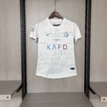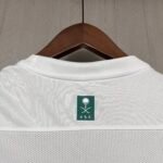 A gola tem formato redondo e é branca, assim como os punhos, enquanto na região frontal é colocado um grafismo, em cinza, trazendo paisagens de Riad, capital saudita.