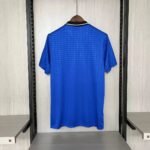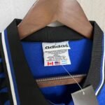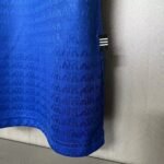 A camisa visitante da Argentina de 1994, eternizada por Maradona, é uma peça icônica de design e história. Predominantemente azul, ela exibe um padrão geométrico em preto no lado esquerdo, formado por formas triangulares que adicionam um toque de ousadia ao visual. O logotipo da Associação de Futebol Argentino (AFA) aparece em destaque no lado esquerdo do peito, com suas clássicas letras “AFA” dentro de um escudo. No centro da camisa, logo abaixo da gola preta com uma linha branca, está o logotipo da Adidas em branco, simbolizando a parceria histórica. As listras pretas nas mangas complementam o design, reforçando o contraste e a elegância dessa camisa que marcou a trajetória de um dos maiores jogadores de todos os tempos.