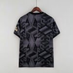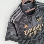 A camisa reserva do Arsenal para a temporada de 2022/2023 é preta e traz um gráfico ao longo do corpo do manto com as letras “AFC” em 3D ao longo de todo o corpo do manto em tom sobre tom, inspirados nas letras vistas pelos torcedores à caminho do Emirates Stadium.