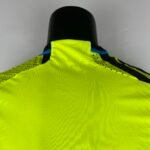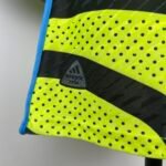 A gola é redonda na cor preta com detalhes em azul celeste nas laterais, cor que também é vista junto ao preto nos punhos e nos recortes laterais e na barra. Já as três listras que percorrem os ombros são pretas.