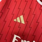 O patrocínio da Emirates é branco, enquanto o “Visit Rwanda” aparece em dourado na manga esquerda, mesma cor do logo da Adidas, no lado direito do peito. Já o escudo do Arsenal é vermelho e dourado.