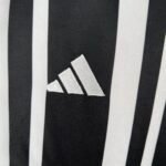 A gola é V na cor preta com detalhes laterais em branco. Já os ombros e mangas são pretos, com as três listras percorrendo os ombros em branco, cor também vista nos punhos.