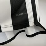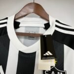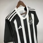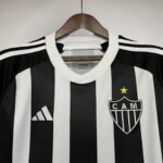 O escudo do Galo é aplicado no lado esquerdo do peito, enquanto o logo da Adidas é visto no lado direito em branco. Os patrocinadores ganham aplicações em preto ou branco, com a Betano tendo seu “B” laranja.