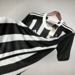 A gola é redonda na cor branca, enquanto os ombros e mangas são pretos com as listras listras percorrendo os ombros em branco. As listras laterais que se juntam na barra traseira são pretas.