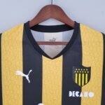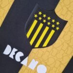 O escudo é aplicado no lado esquerdo do peito e o apelido “Decano” é aplicado em branco logo abaixo. No lado direito, o logo da PUMA ganha o branco, cor também aplicada nos patrocinadores.