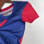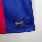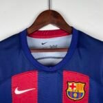 A camisa titular do Barcelona para a temporada 2023-2024 tem de volta as cores blaugranas tradicionais em faixas verticais, sendo duas grenás com uma central azul, com bordas serrilhadas. No template da marca americana para a temporada, os ombros e o “cabide” padrão dele são azuis e se ligam às listras, criando, dessa forma, a figura de um diamond, em homenagem à equipe feminina.