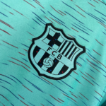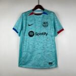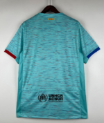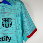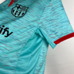 A nova camisa três do Barcelona é azul turquesa e traz um tecido com detalhes em azul e vermelho no efeito mesclado.