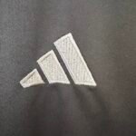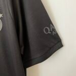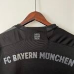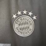 A camisa é predominantemente preta, com detalhes em branco, incluindo o logo da Adidas no ombro direito e o patrocínio da “T-mobile” no centro. Acima do patrocínio, está o emblema do clube com quatro estrelas acima dele. No ombro esquerdo, há outro patrocínio da “Qatar Airways”. A gola é simples e redonda, na cor preta, e as icônicas três listras da Adidas seguem o padrão em preto. Na nuca, é possível ver o lema “Mia san Mia”.