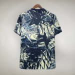 A gola da camiseta é em azul escuro, proporcionando um contraste sofisticado com o restante da peça. Essa combinação de cores e padrões torna a camisa ideal para ser usada durante o aquecimento, destacando-se pela sua originalidade e estilo contemporâneo.
