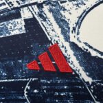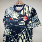 A camisa de pré-jogo e aquecimento do Bayern München apresenta um design único e moderno, com uma estampa em padrão abstrato que lembra uma paisagem urbana caótica ou um conjunto de edifícios, criando uma estética urbana e dinâmica. A camisa conta com detalhes em vermelho, incluindo o logotipo da Adidas no lado esquerdo do peito, que adicionam um contraste vibrante ao conjunto. Na mesma região do peito, há um emblema circular com texto, porém, não é possível ler claramente o que está escrito, o que acrescenta um elemento de mistério ao visual.