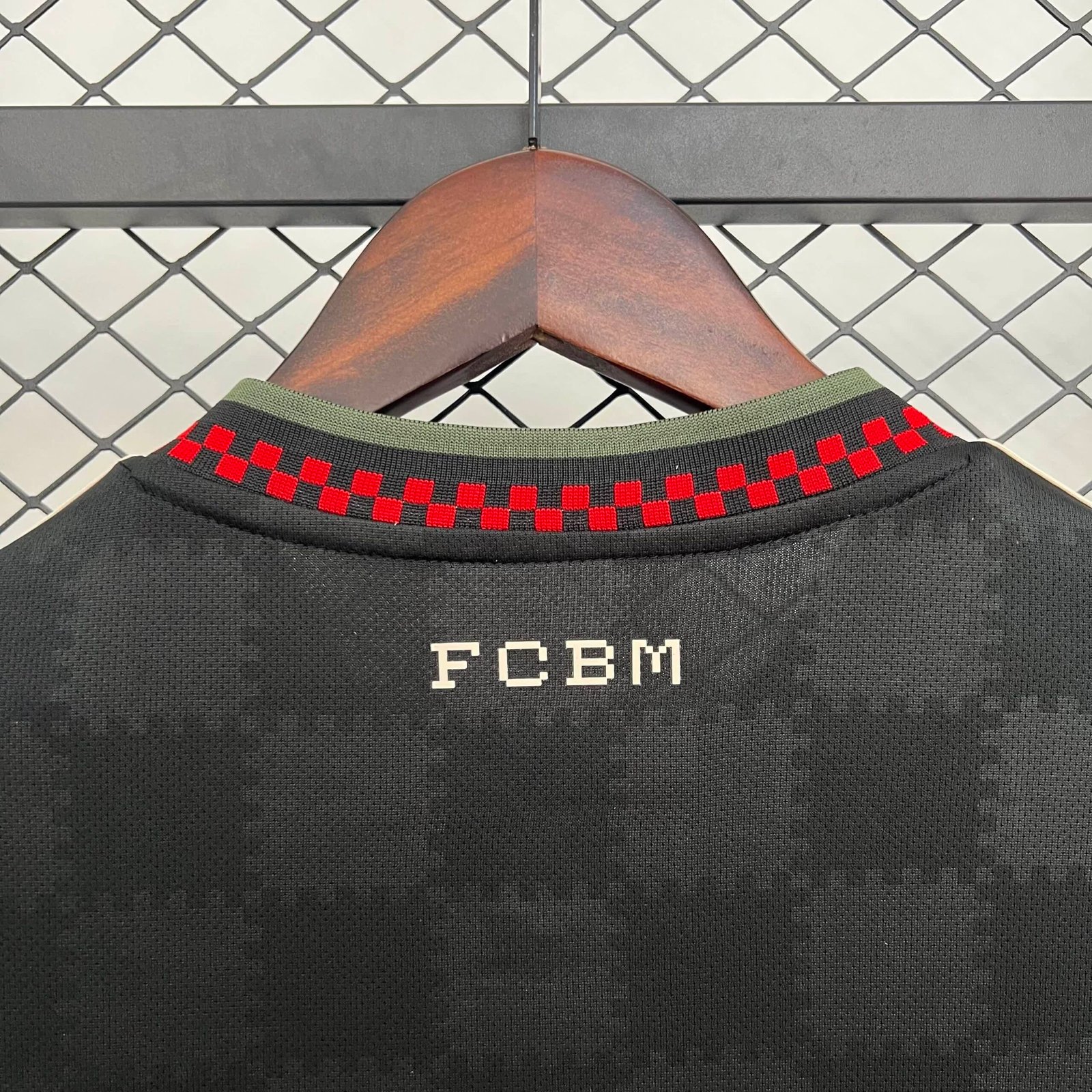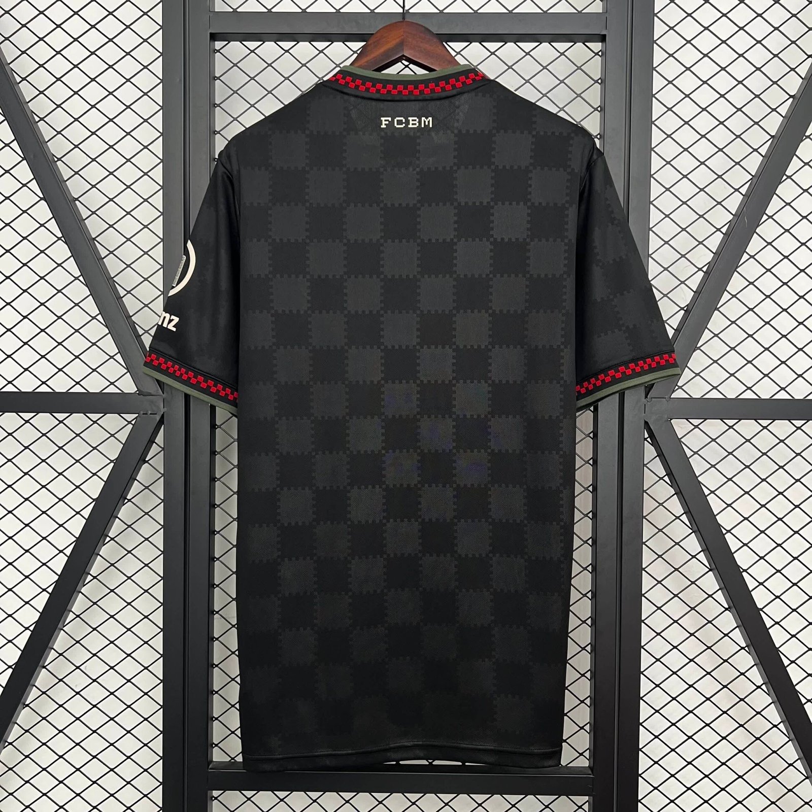 A peça tem a base preta com um padrão xadrez em jacquard e traz gola V preta com borda verde e detalhes em vermelho, que remete à estética urbana de Munique. O padrão é repetido nos punhos.