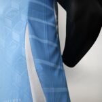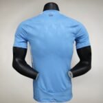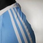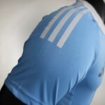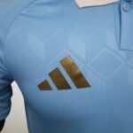 Com o azul celeste como predominante, ele tem o visual mais clássico, com gola pólo branca, mesma cor das três listras nas mangas e dos arcos nas laterais. O padrão jacquard do manto titular aparece novamente e a coroa do logo da federação vai na nuca, em dourado.