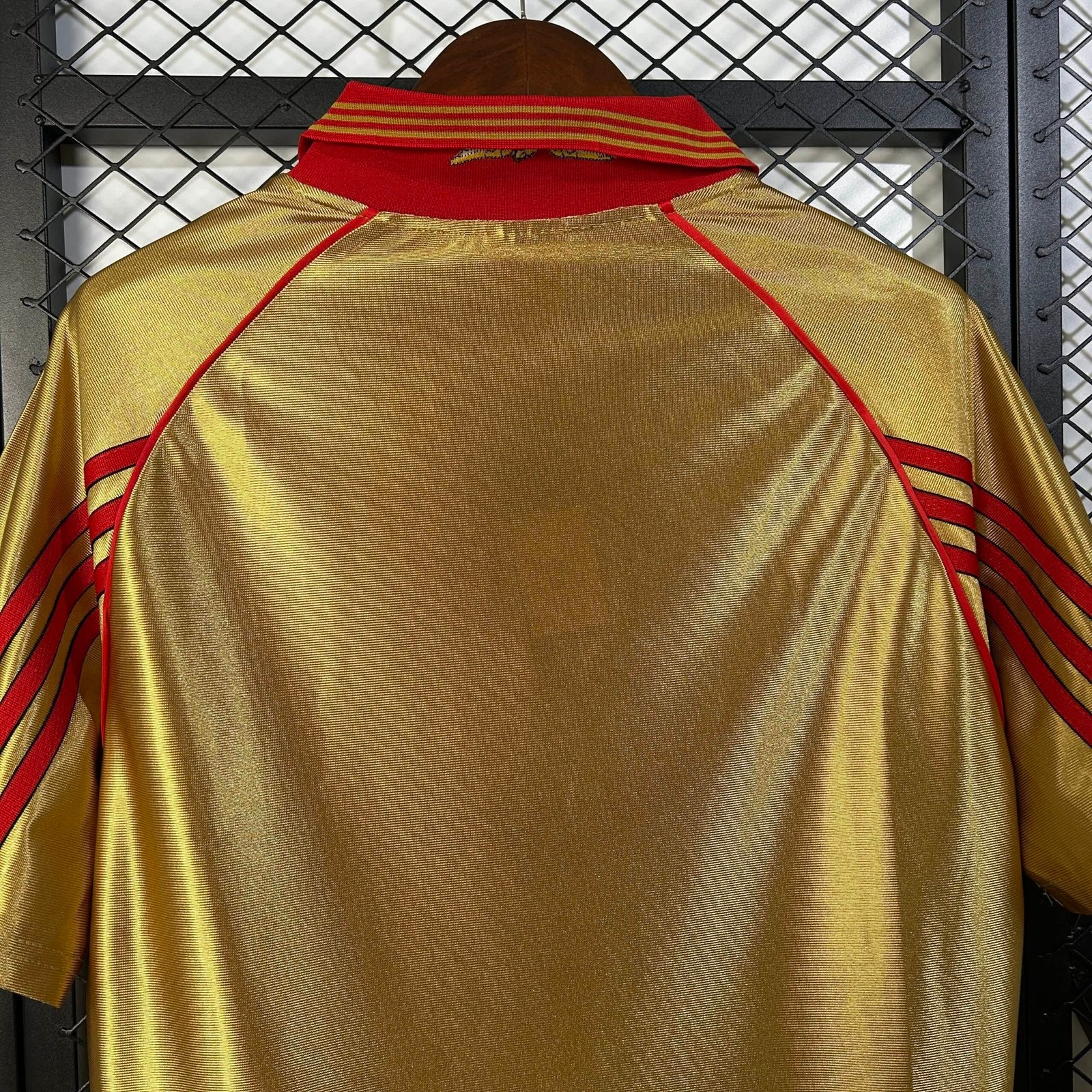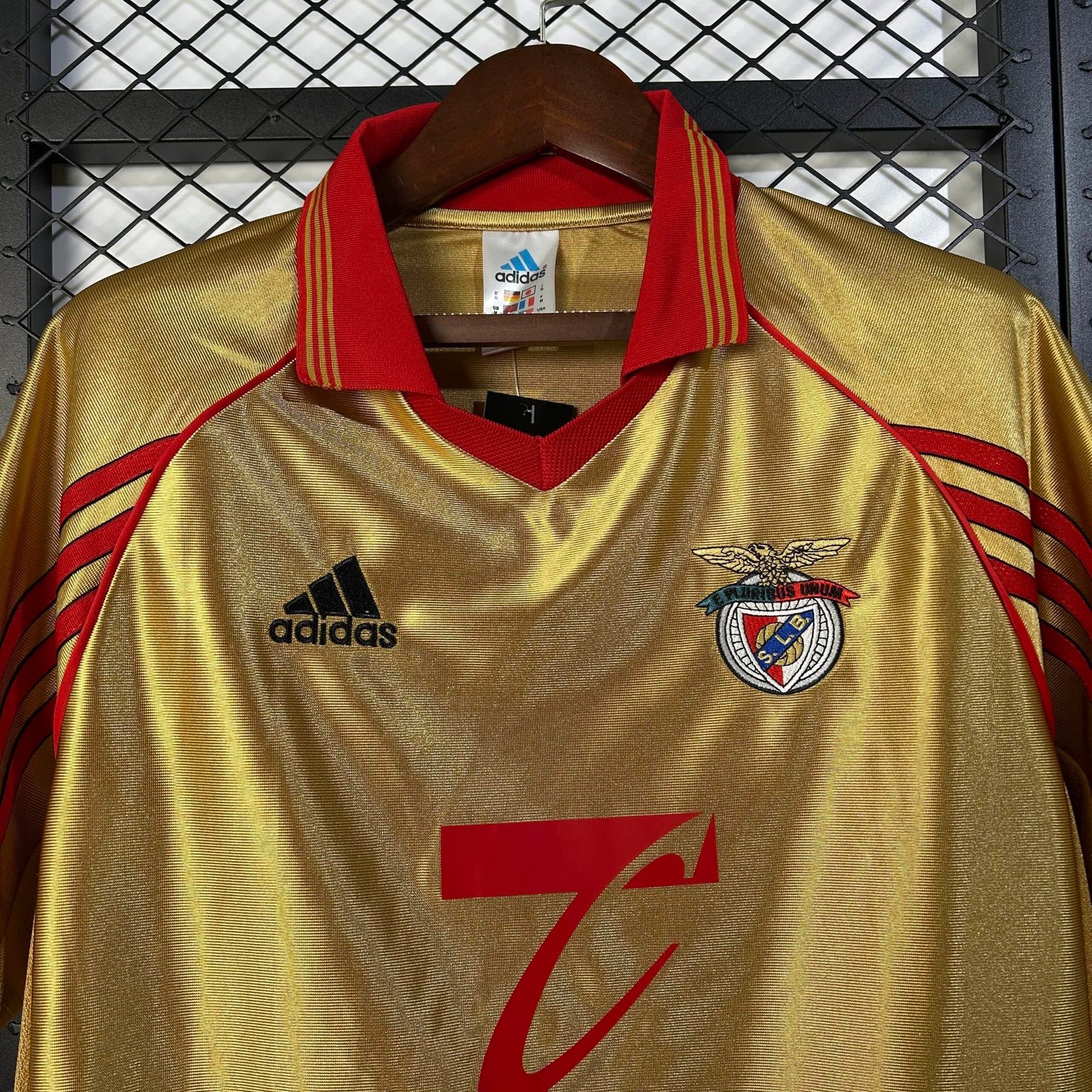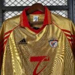 A camisa do SL Benfica na temporada 1998/1999, modelo Away, destacou-se por sua ousadia visual e autenticidade da era final dos anos 90. Predominantemente amarela-dourada cintilante, a peça trouxe um contraste sofisticado com detalhes em vermelho na gola polo e nas três listras nos ombros — distintivos da Adidas — além da estampa em vermelho do patrocinador Telecel no peito