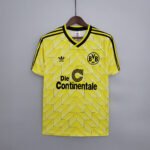No lado esquerdo do peito, o logotipo da Adidas marca presença, enquanto no lado direito está o emblema do Borussia Dortmund, destacado por um círculo amarelo e preto com as letras “BVB 09”. No centro da camisa, encontra-se o patrocínio da “Die Continentale” em letras pretas, ocupando uma posição de destaque.