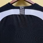 A gola é redonda com a parte frontal preta, enquanto as mangas trazem a parte superior preta e as laterais brancas com os punhos pretos em cima e listrados nas laterais.