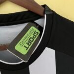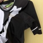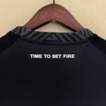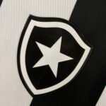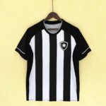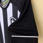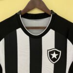 A camisa titular do Botafogo para a temporada de 2022 é caracterizada por listras verticais em preto e branco. A gola é simples e redonda, com detalhes em branco. Linhas brancas e finas também estão presentes nas mangas, complementando o design clássico da camisa. O escudo do Botafogo está localizado no lado esquerdo do peito, destacando-se sobre o fundo listrado. Um detalhe interessante é a frase “Time to set fire”, escrita na nuca da camisa, adicionando um toque de inspiração e motivação ao uniforme.
