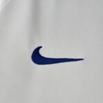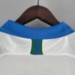A terceira camisa comemorativa do Brasil é totalmente branca e traz detalhes azuis na gola polo, em um detalhe triangular na parte frontal da mesma.
