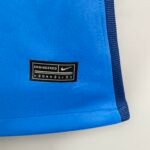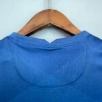 A gola é azul escura e também é redonda e traz um pequeno recorte na nuca,  o azul escuro também aparece nas laterais do kit e nas bordas das mangas.