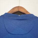 A gola é azul escura e também é redonda e traz um pequeno recorte na nuca,  o azul escuro também aparece nas laterais do kit e nas bordas das mangas.