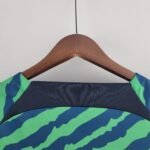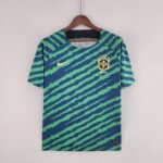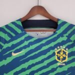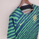 A camisa pré-jogo do Brasil para a disputa da Copa do Mundo traz um design rajado com listras verdes e azul marinho, como se fosse de um tigre. Vale lembrar que nas camisas de jogo, tem detalhes tanto na camisa amarela, quanto na azul, em animal print, que lembram uma onça-pintada.