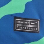 O escudo é aplicado no lado esquerdo do peito com o fundo amarelo com informações em azul marinho. O Swoosh da Nike, no lado direito do peito, é amarelo.