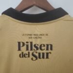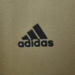 Este modelo masculino traz o dourado junto com o preto, que é visto na gola polo, nas laterais e axilas do kit, bem como na aplicação do logo da Adidas, nas três listras nos ombros e do patrocínio.