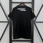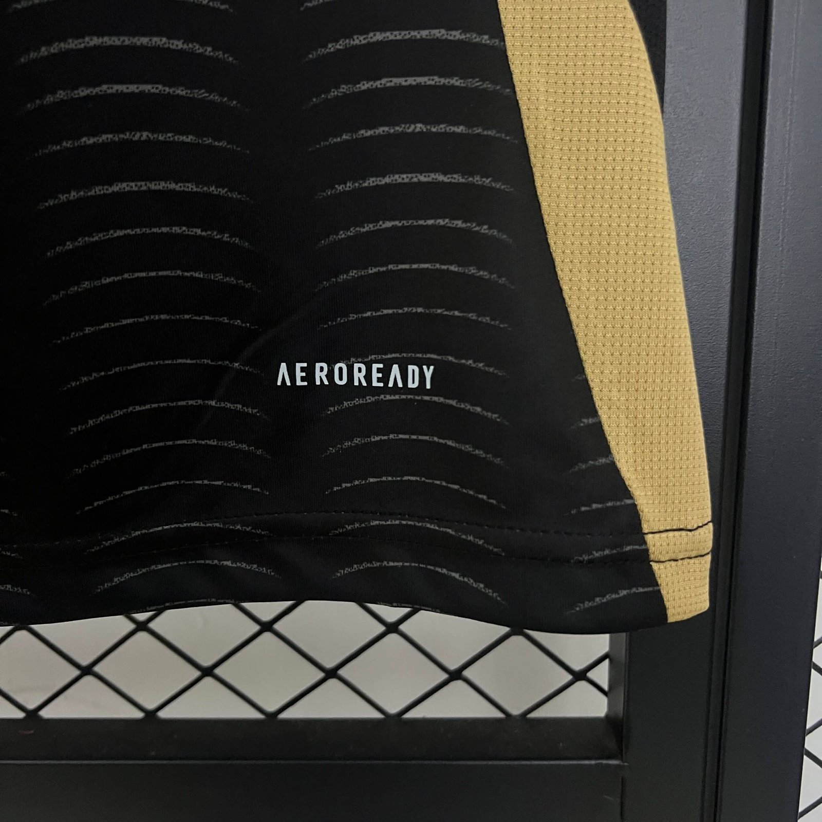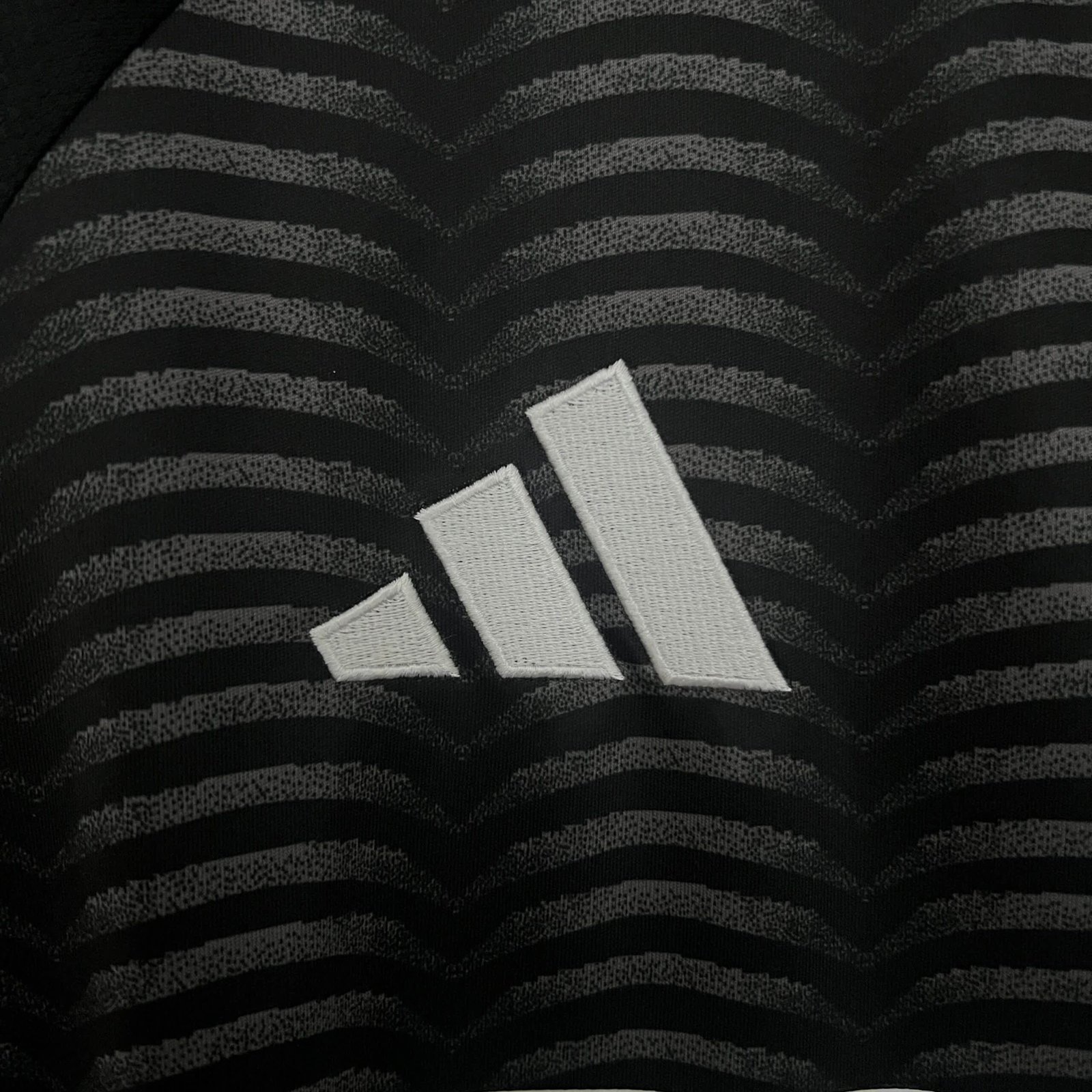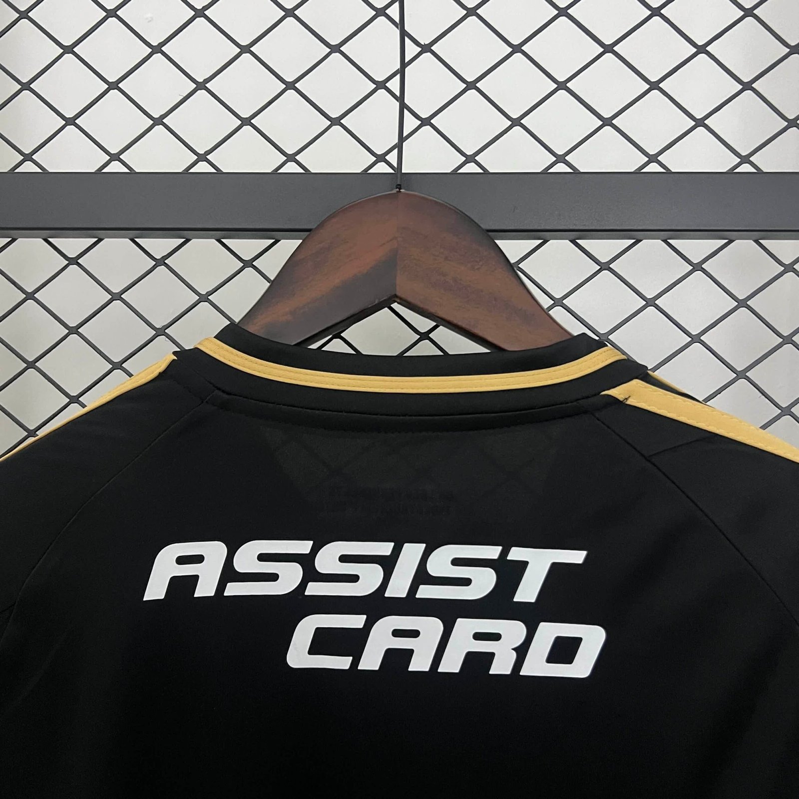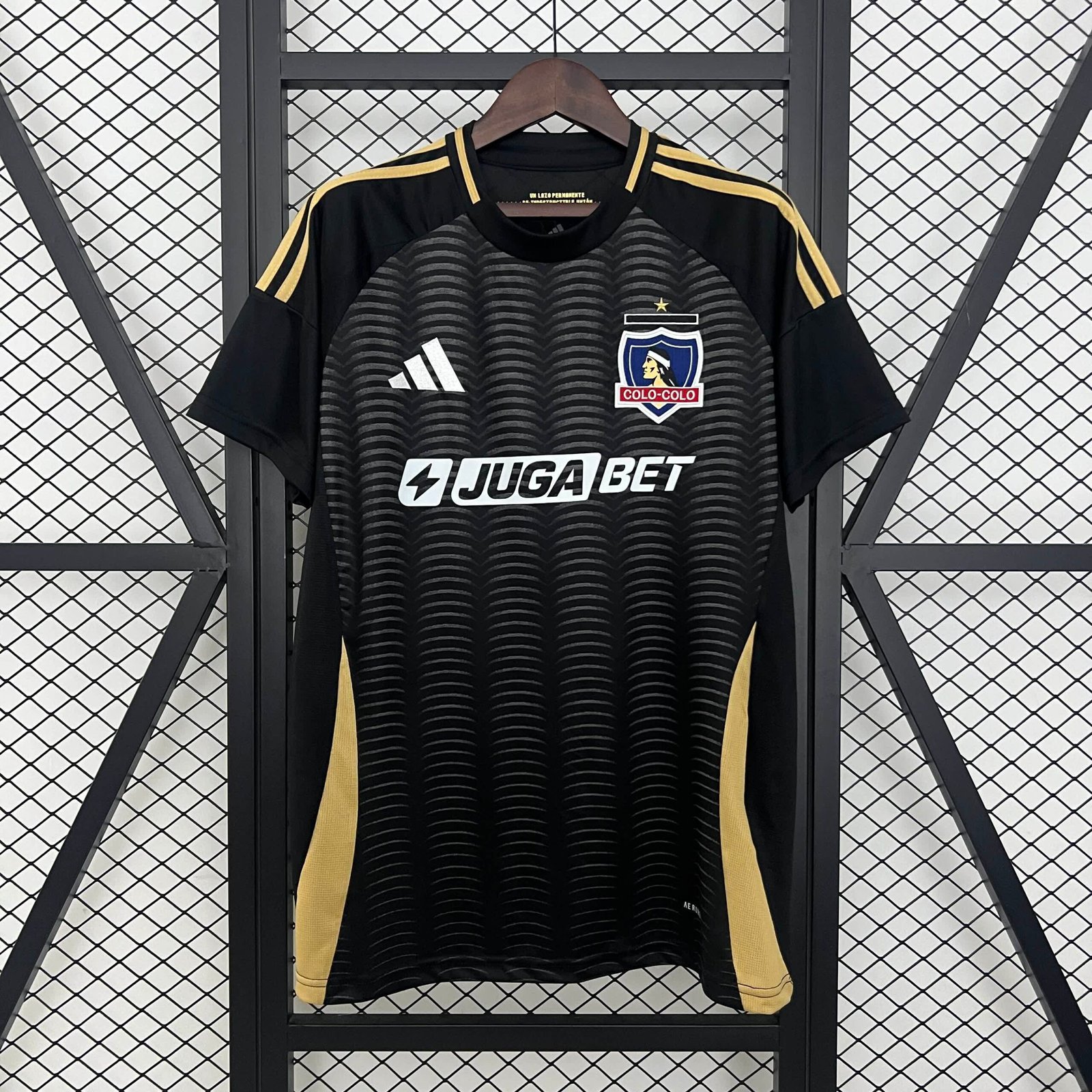 A nova camisa reserva do Colo-Colo traz o mesmo template Tiro 24 como base, agora na cor preta, e traz na região frontal um grafismo com diversos riscos em arco, em tons de cinza. A gola é preta e traz detalhes em dourado, mesma cor das três listras nas mangas e nos arcos laterais.