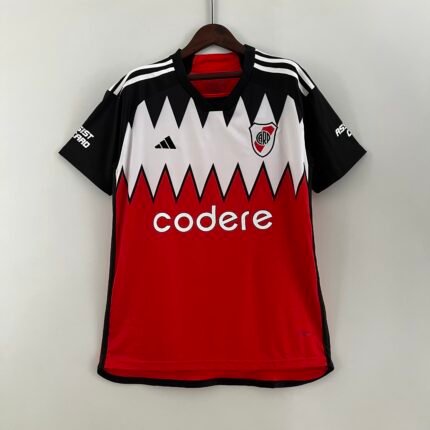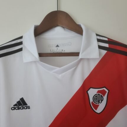 As três listras percorrem os ombros em cinza, e as mangas são totalmente brancas. No peito, o escudo, com a eterna tarja preta de luto, é aplicado no lado esquerdo, enquanto o logo da Adidas aparece em preto, no lado direito, cor esta que também está nos patrocínios e em recortes nas laterais.