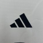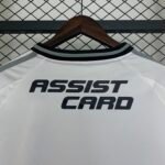 A gola é V e traz a parte frontal branca, coma nuca preta com friso cinza. Dentro da gola, a frase “Um lazo permanente de indestructible unión – 1925 – 2025” (Um laço permanente de indestrutível união) é vista em dourado.