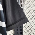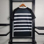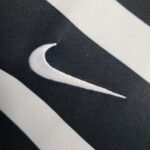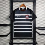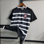 A camisa do Corinthians na temporada 2014/2015, modelo visitante, apresenta um design que unia modernidade e tradição. Predominantemente preta, foi marcada por listras verticais em branco que percorrem toda a peça, criando um contraste clássico e imponente. O escudo alvinegro, aplicado em sua forma tradicional, ganhou ainda mais destaque sobre o fundo escuro. A gola em formato polo, também preta, com sutil detalhe em branco, adicionava elegância ao uniforme, enquanto as mangas mantinham o equilíbrio visual da composição. Um manto que resgatava a identidade histórica do clube, trazendo de volta as listras, mas com um toque contemporâneo, tornando-se um dos modelos mais emblemáticos da década.