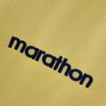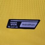O novo escudo da FEF é aplicado no lado esquerdo do peito, enquanto o logo da Marathon aparece no lado direito.