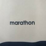 O escudo é aplicado em dourado no lado esquerdo do peito, enquanto o logo da Marathon aparece no mesmo tom de azul no lado direito.