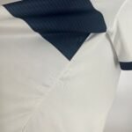 A gola é V em azul escuro, cor qu também é vista nos punhos e na parte traseira da barra.