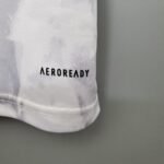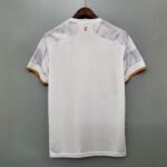 A  camisa reserva da  Espanha para a Euro é predominantemente branca e traz gola V branca com detalhes prateados nas três listras nos ombros e o escudo e o logo da  Adidas em vermelho.