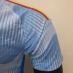 A gola é redonda em um estilo entrelaçado em azul celeste com um tom mais escuro do azul nas laterais. Já as três listras percorrem os ombros em vermelho, e amarelo se alternando.