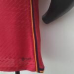 O manto é vermelho e traz gola “V” nas cores azul marinho, vermelho e amarelo, com detalhe frontal em azul marinho. As três listras percorrem os ombros em azul marinho, cor que também é vista nas laterais e na barra inferior do kit.
