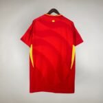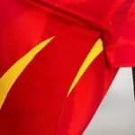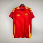 A camisa titular da Seleção da Espanha para a disputa da Euro tem como principal destaque a retirada total do azul, bem presente no manto anterior, lançado para a Copa do Mundo. Com o vermelho “Fúria” tradicional, o novo manto é inspirado no novo template da marca e traz o amarelo como segunda cor, aparecendo nos arcos laterais, em faixa na gola e nas três listras da marca, nas mangas.