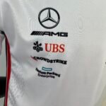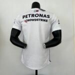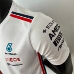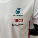 A camisa da equipe Mercedes AMG Petronas para a temporada de 2023 na Fórmula 1 ostenta predominantemente a cor branca. Os patrocínios de parceiros se destacam tanto no lado direito quanto no esquerdo do peito, com alguns também presentes nas mangas. Duas faixas, uma vermelha e outra preta, adornam com elegância a região dos ombros, conferindo um toque distintivo e dinâmico ao design. Esta combinação de elementos resulta em uma peça única que não apenas reflete a identidade da equipe, mas também destaca suas parcerias durante esta empolgante temporada.