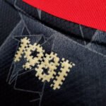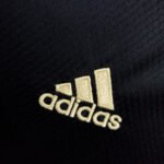Predominantemente preta, a peça traz faixas horizontais ao longo do manto com padrão em degrade em tons de cinza que tem inspiração nos origamis japoneses, já vistos no manto reserva. O monograma CRF é visto em dourado, assim como o logo da Adidas, no lado direito do peito.