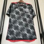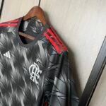 A nova terceira camisa do Flamengo é preta e traz ao longo de toda a parte frontal, um gráfico que remete à diamantes em tons prateados. O escudo “CRF” ganha a cor prata, assim como o logo da Adidas e a aplicação dos patrocinadores.