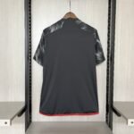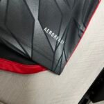 A gola é redonda em preto, enquanto as três listras percorrem os ombros em vermelho, cor que também é vista nos recortes da barra e laterais do kit.