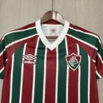 O escudo do Fluminense é ostentado no lado esquerdo do peito, enquanto o logo da Umbro aparece em branco com bordas grenás no lado direito. O patrocínio da Superbet é aplicado no mesmo padrão no espaço nobre do kit.