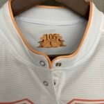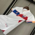 A nova camisa comemorativa do Fortaleza pelos seus 105 anos é branca e conta uma faixa na altura do peito, nas cores azul e vermelha com linhas douradas no entorno.