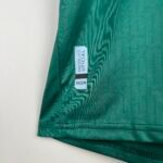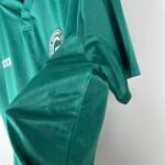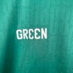 O escudo é aplicado em sua forma completa no lado esquerdo do peito, enquanto no lado direito, o logo da Green é aplicado em branco.