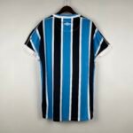A camisa titular do Grêmio para a temporada traz as inconfundíveis faixas verticais em azul celeste e preto separadas por linhas brancas.