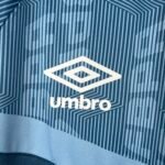 Na parte frontal, acima do peito, um intrigante padrão é formado por linhas geométricas que se entrelaçam e delineiam um losango central. Sobre esse fundo, o acrógrafo FBPA do tricolor gaúcho adiciona uma camada simbólica à peça. O Swoosh da Umbro, em branco, destaca-se no lado direito, enquanto o escudo do Grêmio ocupa seu lugar tradicional à esquerda.