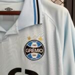 No peito, o escudo aparece no lado esquerdo, enquanto o logo da Umbro é visto em preto. Na nuca, abaixo do Double Diamond, vai a bandeira do Rio Grande do Sul.